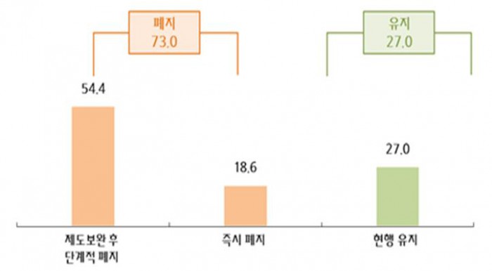 또 즉시 폐지(18.6%)보다는 단계적 폐지(54.4%)를 선호하는 것으로 나타났다.