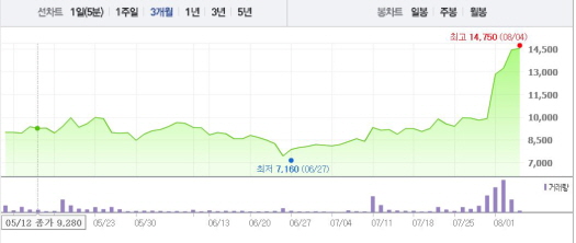 이는 2주 전 주가인 7월19일(9070원)과 비교했을 때 59.86% 상승한 수치다.