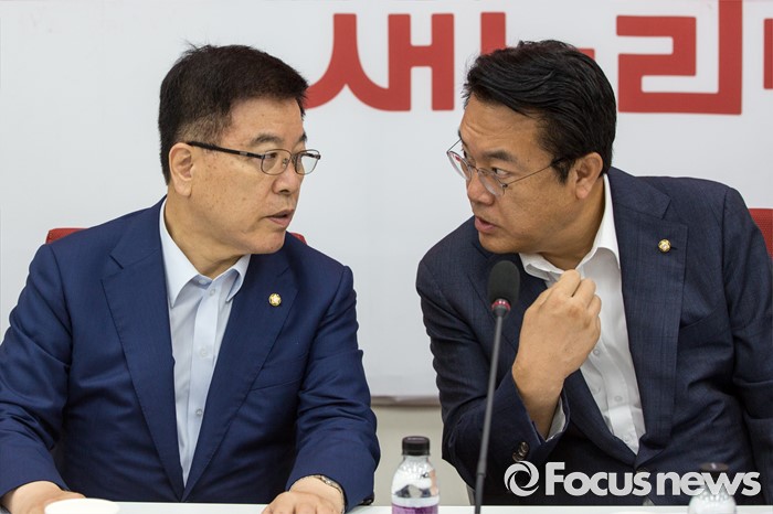 (서울=포커스뉴스) 정진석(오른쪽) 새누리당 원내대표와 김광림 정책위의장이 2일 오전 서울 여의도 국회에서 열린 원내대책회의에 참석해 의견을 나누고 있다.