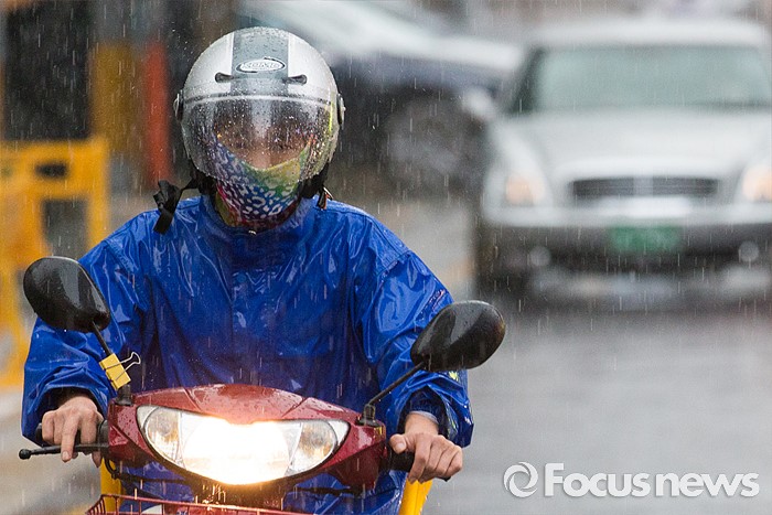 (서울=포커스뉴스) 천둥, 번개를 동반한 강한 비가 내린 2일 오후 서울 서초구 교대역 주변에서 배달 직원이 오토바이를 운전하고 있다.