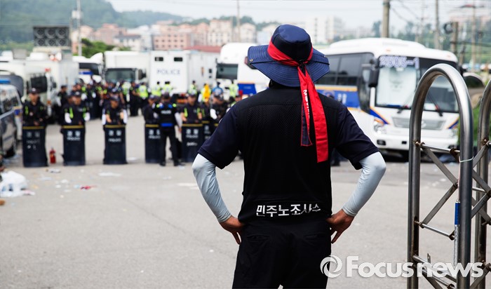 (아산=포커스뉴스) 1일 오전 충남 아산 탕정면 갑을오토텍에서 노조원들이 사측의 경비 용역 투입에 대비하고 있다.