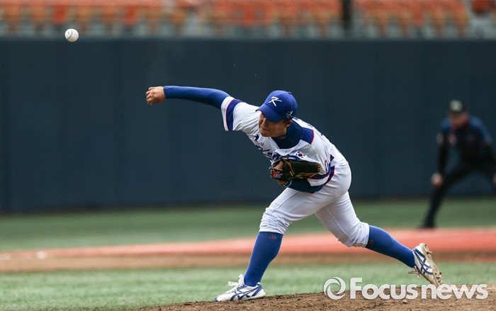 (서울=포커스뉴스) 1일 오후 서울 양천구 목동종합운동장에서 열린 2016 세계 청소년 야구 대회 '한국A VS 일본A' 경기에서 1회말 박주성 선수가 역투하고 있다