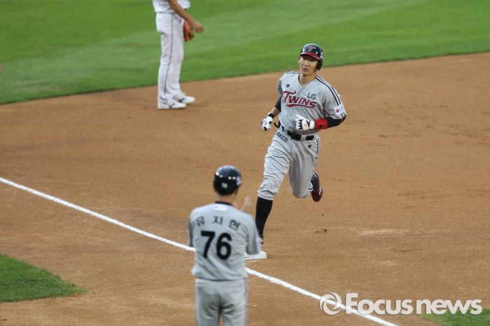 (서울=포커스뉴스) 2일 오후 서울 잠실구장에서 열린 2016 프로야구 LG-두산 경기 1회초 무사, 손주인이 솔로 홈런을 치고 홈으로 달리고 있다.
