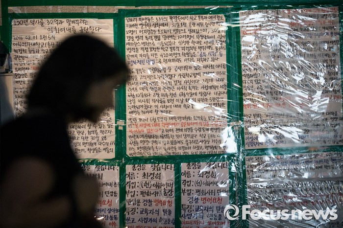(서울=포커스뉴스) 미래라이프 대학 설립에 반대하는 학생들이 엿새째 이화여대 본관을 점거하고 있는 2일 밤, 서울 서대문구 이화여대 교내에 단과대학 설립을 반대하는 대자보가 붙어 있다.