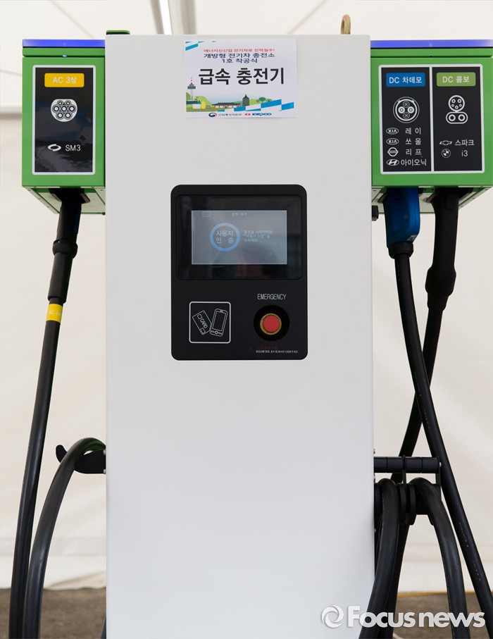 (서울=포커스뉴스) 2일 오후 서울 마포구 상암월드컵경기장에서 열린 개방형 전기차 충전소 1호 착공식에서 급속충전기가 전시돼 있다.