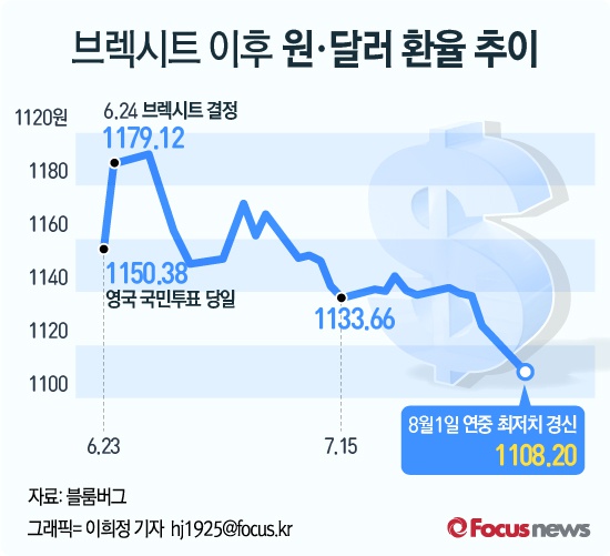 (서울=포커스뉴스) 1일 서울 외환시장의 원·달러 환율은 13개월만에 1108원대까지 하락했다. 이는 2015년 6월 23일(1104.6원) 이후 최저치다.