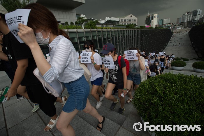 (서울=포커스뉴스) 2일 오후 서울 서대문구 이화여대에서 미래라이프 대학 설립에 반대하는 이화여자대학교 학생들이 교내를 행진하며 시위하고 있다.
