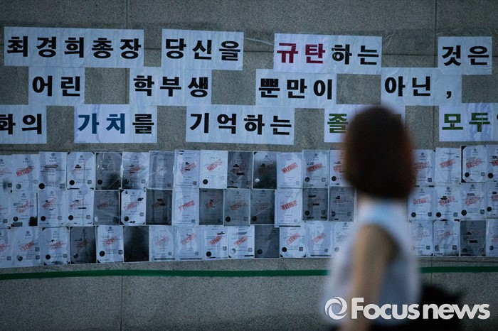 (서울=포커스뉴스) 미래라이프 대학 설립에 반대하는 학생들이 엿새째 이화여대 본관을 점거하고 있는 2일 밤, 서울 서대문구 이화여대 교내에 다양한 목소리의 시위성 글들이 붙어 있다.