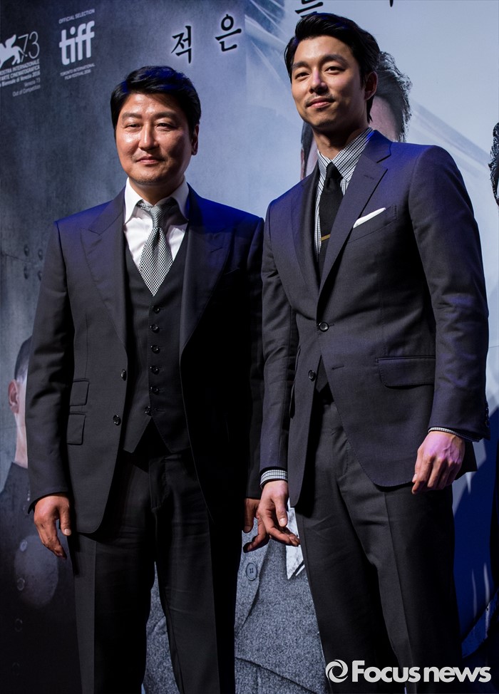 (서울=포커스뉴스) 배우 송강호(왼쪽), 공유가 4일 오전 서울 강남구 압구정 CGV에서 열린 영화 '밀정' 제작보고회에 참석해 포즈를 취하고 있다. 배우 송강호, 공유, 한지민, 엄태구, 신성록 등이 출연하는 영화 '밀정'은 일제 강점기 무장독립단체 의열단과 일본 경찰 간의 암투를 그린 작품으로 오는 9월 개봉 예정이다.