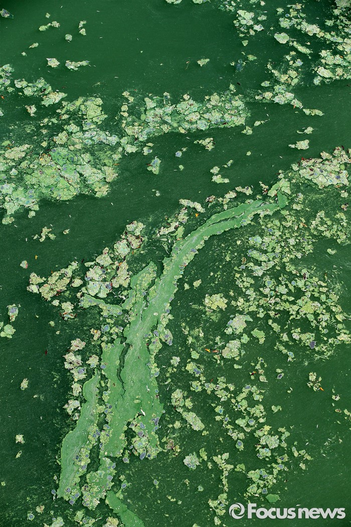 (청주=포커스뉴스) 폭염이 이어지면서 대청호 수역에 조류경보 '관심' 단계가 내려진 가운데 4일 오후 충북 청주시 상당구 문의대교 인근 대청호에 녹조가 형성돼 있다.