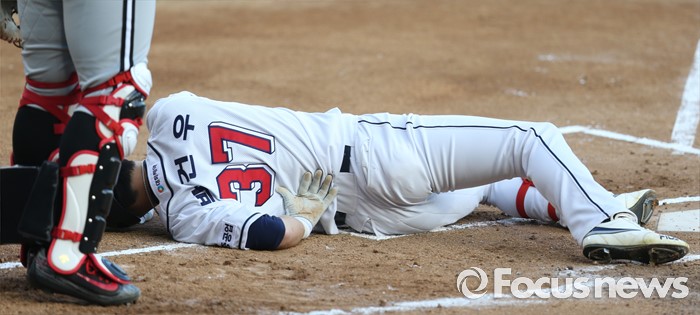 (서울=포커스뉴스) 4일 서울 잠실구장에서 열린 2016 프로야구 LG-두산 경기에서 1회말 두산 선두타자 박건우가 LG 투수 임찬규의 투구에 맞고 타석에 쓰러져 있다.