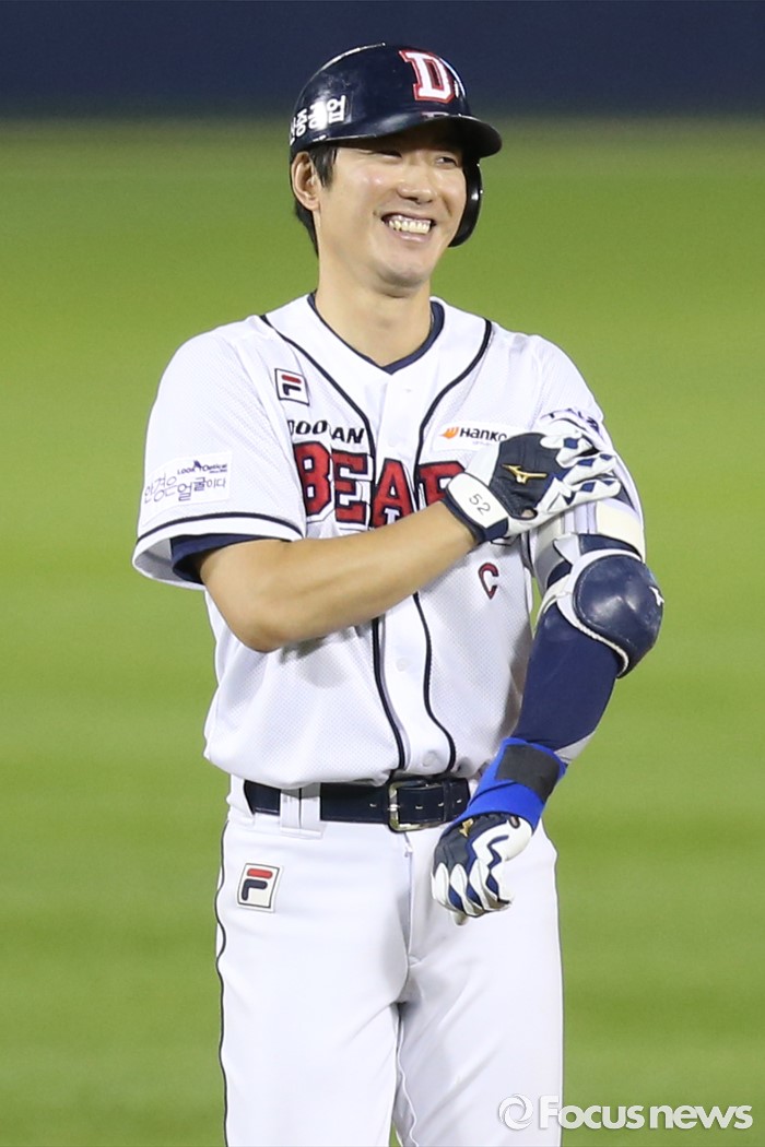 (서울=포커스뉴스) 4일 서울 잠실구장에서 열린 2016 프로야구 LG-두산 경기 6회말 2사 3루에서 두산 김재호가 우익수를 넘기는 2루타를 치고 2루에서 밝게 웃고 있다.
