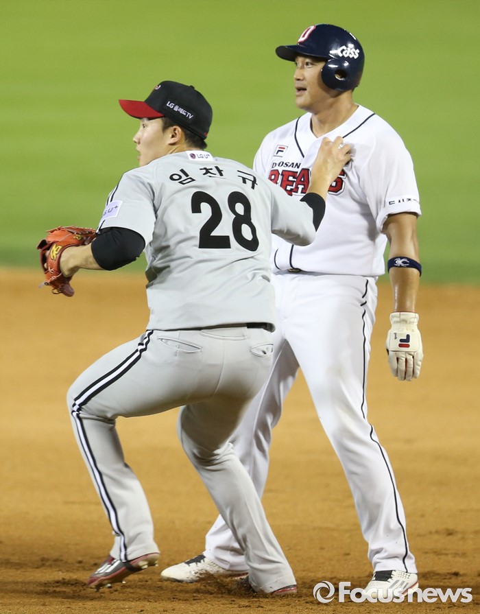 (서울=포커스뉴스) 4일 서울 잠실구장에서 열린 2016 프로야구 LG-두산 경기 6회말 무사 1,2루에서 런다운에 걸린 두산 1루주자 홍성흔이 LG 투수 임찬규에게 태그아웃되고 있다.