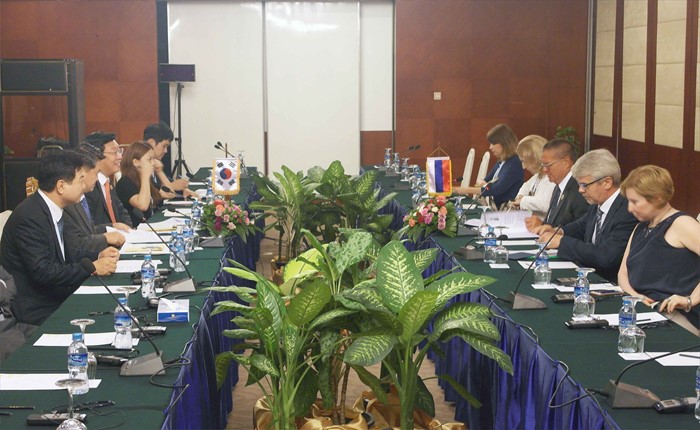 (서울=포커스뉴스) 주형환 산업통상자원부 장관이 4일(현지시간) 라오스 비엔티안 돈 찬 호텔에서 알렉세이 울류카에프(Alexei Ulyukayev) 러시아 경제개발부 장관과 한-러시아 양자회담을 갖고 있다. <사진제공=산업통상자원부>