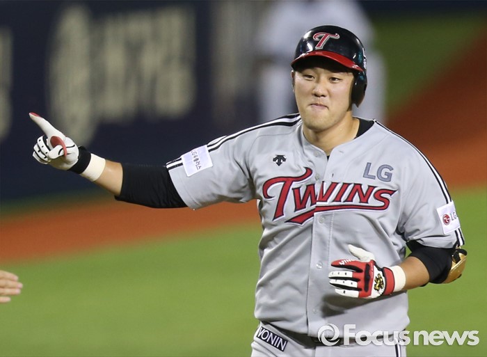 (서울=포커스뉴스) 4일 서울 잠실구장에서 열린 2016 프로야구 LG-두산 경기 8회초 1사후 LG 양석환이 중월 솔로 홈런을 치고 더그아웃을 가리키며 3루를 돌고 있다.