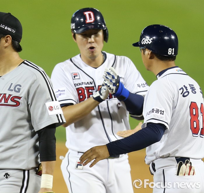(서울=포커스뉴스) 4일 서울 잠실구장에서 열린 2016 프로야구 LG-두산 경기 8회말 2사 3루에서 두산 김재호가 동점 중전 안타를 치고 1루에서 강동우 코치와 함께 기뻐하고 있다.