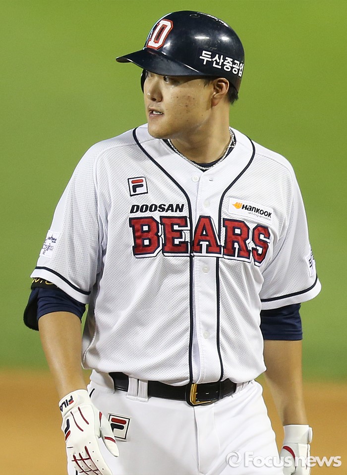 (서울=포커스뉴스) 4일 서울 잠실구장에서 열린 2016 프로야구 LG-두산 경기 연장 10회말 1사 1루에서 두산 오재일이 우전 안타를 치고 3루까지 달린 1루주자 오재원을 바라보고 있다.
