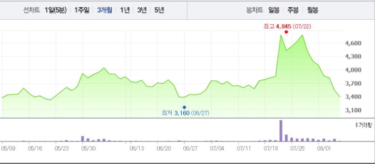 이는 일주일 전 주가인 7월28일(4400원)과 비교했을 때 22.84% 떨어진 수치다.