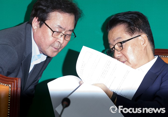 (서울=포커스뉴스) 5일 오전 서울 여의도 국회에서 열린 국민의당 비상대책위원회에 참석한 박지원(오른쪽) 비상대책위원장과 부좌현 수석사무부총장이 대화하고 있다.