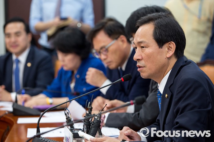 (서울=포커스뉴스) 우상호 더불어민주당 원내대표가 5일 오전 서울 여의도 국회에서 열린 상임위원회 간사단 간담회에 참석해 모두발언 하고 있다.