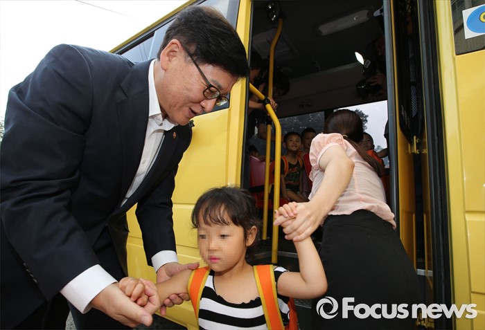 (세종=포커스뉴스) 정진엽 보건복지부 장관이 5일 오전 세종시 금남면 금남어린이집을 방문, 어린이통학차량으로 등원하는 어린이를 차량에서 내려주고 있다.