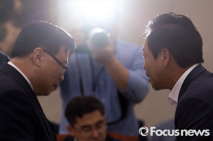 (서울=포커스뉴스) 이완영(오른쪽) 새누리당 의원과 이동필 농림축산식품부 장관이 5일 오전 서울 여의도 국회에서 열린 국회 농림축산식품해양수산위원회 전체회의에 참석해 대화 하고 있다.