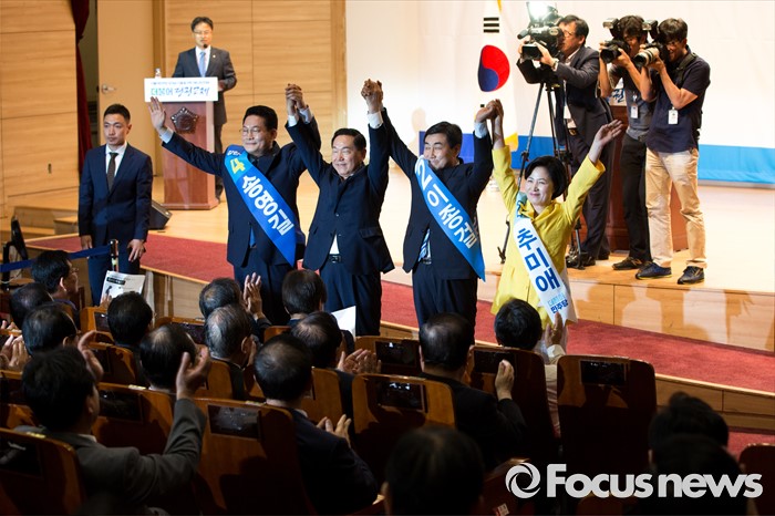 (서울=포커스뉴스) 더불어민주당 전당대회 당대표에 출마한 후보들이 5일 오후 서울 여의도 국회의원회관에서 열린 '전당대회 당대표 예비경선'에 참석해 정견발표에 앞서 손을 잡고 사진촬영을 하고 있다. 왼쪽부터 송영길 후보, 김상곤 후보, 이종걸 후보, 추미애 후보.