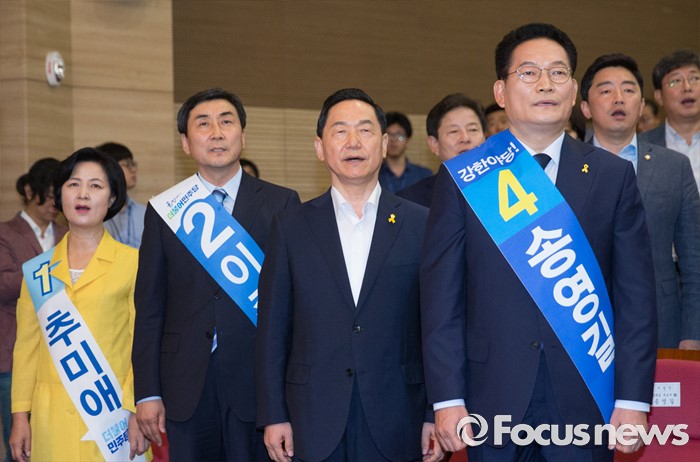(서울=포커스뉴스) 5일 오후 서울 여의도 국회 의원회관에서 열린 더불어민주당 당대표 선출을 위한 예비경선대회에 참석한 추미애(왼쪽부터), 이종걸, 김상곤, 송영길 당대표 후보가 애국가를 부르고 있다.