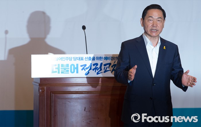 (서울=포커스뉴스) 5일 오후 서울 여의도 국회 의원회관에서 열린 더불어민주당 당대표 선출을 위한 예비경선대회에 참석한 김상곤 당대표 후보가 정견발표를 하고 있다.