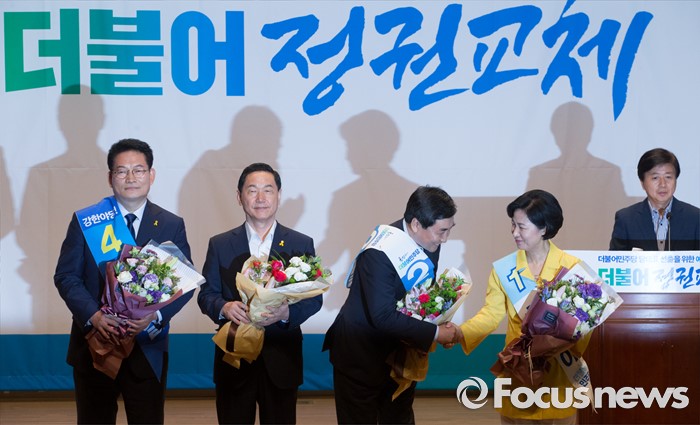 (서울=포커스뉴스) 5일 오후 서울 여의도 국회 의원회관에서 열린 더불어민주당 당대표 선출을 위한 예비경선대회에 참석한 이종걸, 추미애 당대표 후보가 경선 통과 후 인사하고 있다. 왼쪽부터 송영길, 김상곤, 이종걸, 추미애 후보, 노웅래 선거관리위원장. 이날 경선에서는 송영길 당대표 후보가 탈락했다.
