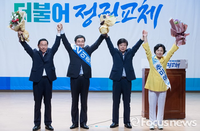 (서울=포커스뉴스) 5일 오후 서울 여의도 국회 의원회관에서 더불어민주당 당대표 선출을 위한 예비경선대회를 마친 김상곤(왼쪽부터), 이종걸 당대표 후보, 노웅래 선거관리위원장, 추미애 당대표 후보가 취재진을 향해 포즈를 취하고 있다.