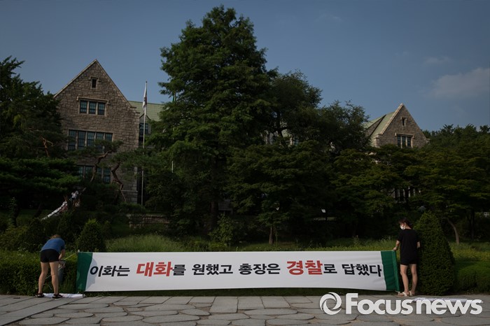 (서울=포커스뉴스) 5일 오후 서울 서대문구 이화여자대학교에서 '미래라이프 대학(평생교육 단과대학 지원사업)' 설립을 반대하는 이화여대 학생들이 최경희 총장의 사퇴를 촉구하며 교내에 대형 플래카드를 붙이고 있다. 이날 최경희 이화여대 총장은 대학 본관 점거농성 중 교수·교직원 감금 혐의를 받고 있는 학생들의 처벌을 원치 않는다며 탄원서를 경찰에 제출했고 농성 중인 이화여대 학생들은 “이중적 행동”이라며 최 총장의 사퇴를 거듭 촉구했다.
