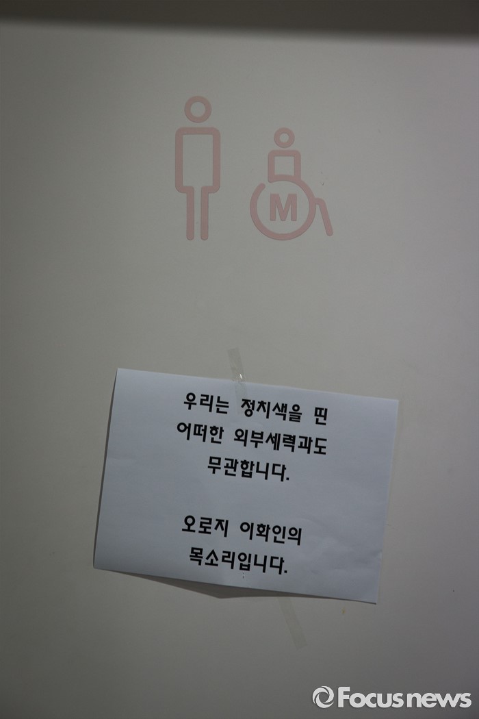 (서울=포커스뉴스) 5일 오후 서울 서대문구 이화여자대학교에서 '미래라이프 대학(평생교육 단과대학 지원사업)' 설립을 반대하는 이화여대 학생들이 교내 화장실에 붙인 "우리는 정치색을 띤 어떠한 외부세력과도 무관합니다."란 메시지가 보이고 있다.
