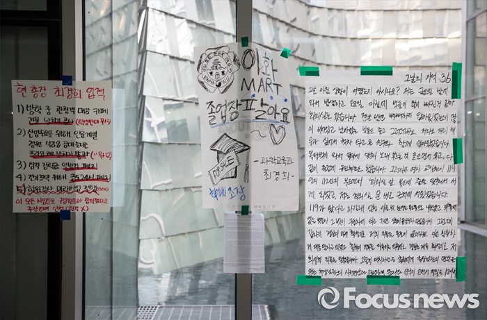 (서울=포커스뉴스) 5일 오후 서울 서대문구 이화여대 교내에 최경희 이화여대 총장의 미래라이프 단과대학 설립 추진을 규탄하는 대자보가 부착돼 있다. 이날 최경희 이화여대 총장은 대학 본관 점거농성 중 교수·교직원 감금 혐의를 받고 있는 학생들의 처벌을 원치 않는다며 탄원서를 경찰에 제출했고 농성 중인 이화여대 학생들은 “이중적 행동”이라며 최 총장의 사퇴를 거듭 촉구했다.