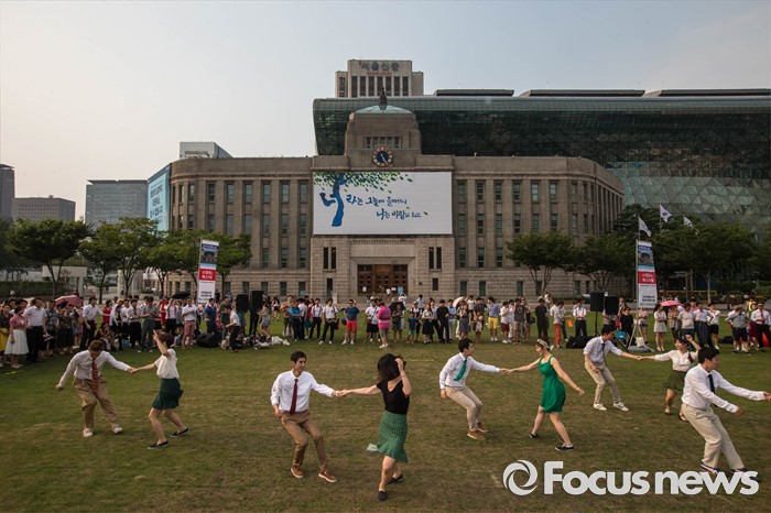(서울=포커스뉴스) 6일 오후 서울 중구 시청 앞 광장에서 열린 '서울 스윙댄스 페스티벌'에서 청년문화예술단체 딴따라땐스홀 회원들이 음악에 맞춰 스윙댄스를 추고 있다.