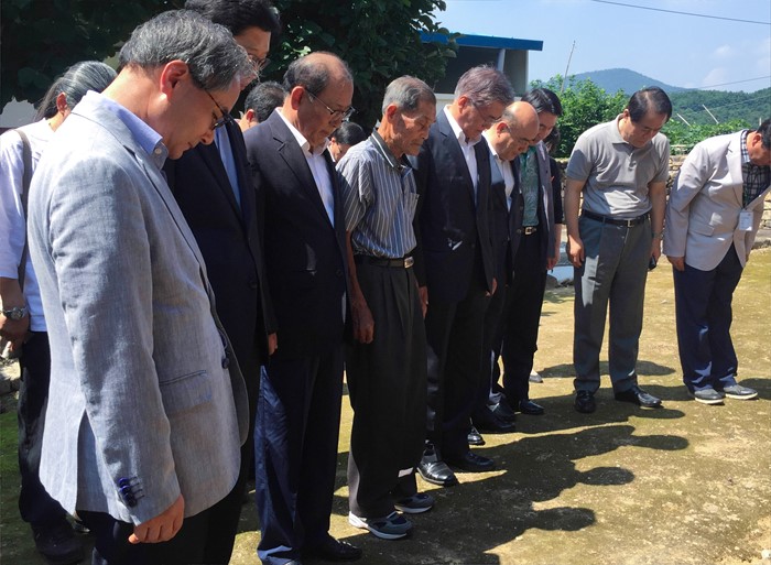 (서울=포커스뉴스) 문재인 더불어민주당 전 대표가 7일 오전 전남 광양 봉강면 매천 황현 선생 생가를 방문해 관계자들과 함께 영정 앞에서 묵념을 하고 있다. <사진제공=문재인 전 대표측>