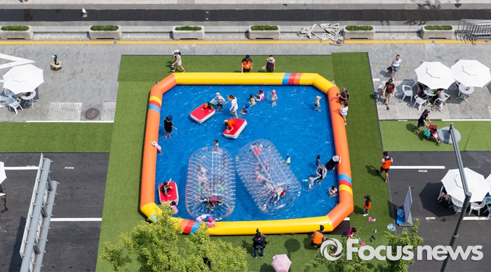 (서울=포커스뉴스) 절기상 입추인 7일 오후 서울 종로구 광화문 세종대로에 설치된 물놀이장에서 어린이들이 즐거운 시간을 보내고 있다.
