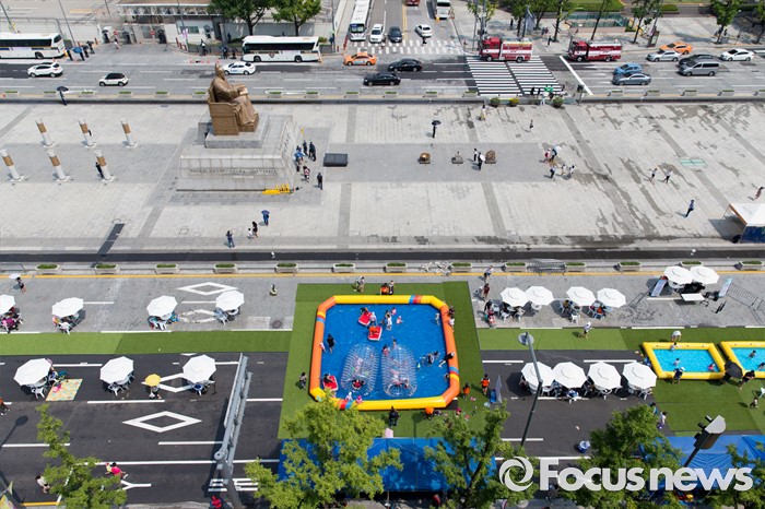 (서울=포커스뉴스) 절기상 입추인 7일 오후 서울 종로구 광화문 세종대로에 설치된 물놀이장에서 어린이들이 즐거운 시간을 보내고 있다.