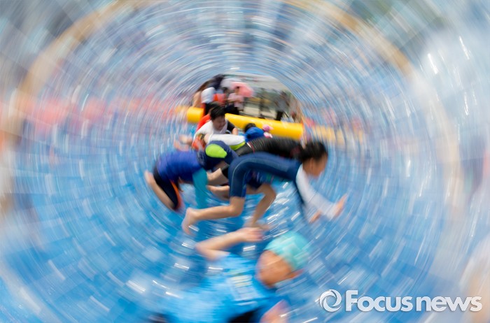 (서울=포커스뉴스) 절기상 입추인 7일 오후 서울 종로구 광화문 세종대로에 설치된 물놀이장에서 어린이들이 워터롤러를 타며 즐거운 시간을 보내고 있다.