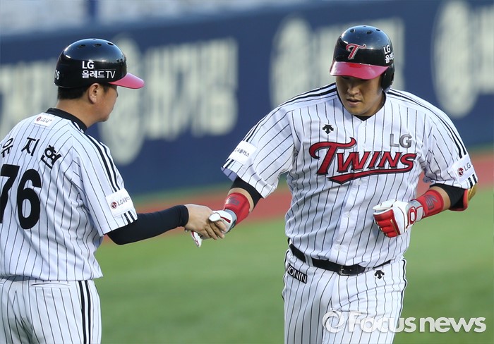 (서울=포커스뉴스) 5일 서울 잠실구장에서 열린 2016 프로야구 kt-LG 경기 3회말 LG 선두타자 유강남이 좌월 솔로 홈런을 치고 3루를 돌며 유지현 코치와 악수하고 있다.