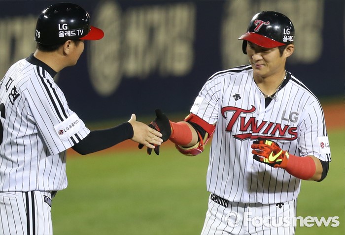(서울=포커스뉴스) 5일 서울 잠실구장에서 열린 2016 프로야구 kt-LG 경기 7회말 2사후 LG 오지환이 우월 솔로 홈런을 치고 3루를 돌며 유지현 코치와 악수하고 있다.