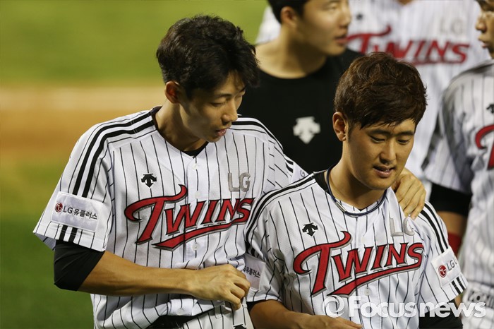 (서울=포커스뉴스) 5일 서울 잠실구장에서 열린 2016 프로야구 kt-LG 경기에서 kt와의 3연전을 모두 승리한 LG의 김용의(왼쪽)가 정주현과 어깨동무를 한채 대화하고 있다.
