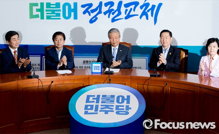 (서울=포커스뉴스) 8일 오전 서울 여의도 국회에서 열린 더불어민주당 당대표 및 부문별 최고위원 선출을 위한 공명선거 협약식에 참석한 지도부 및 당대표 후보들이 박수치고 있다. 왼쪽부터 이종걸 당대표 후보, 노웅래 선거관리위원장, 김종인 비대위 대표, 김상곤, 추미애 당대표 후보.