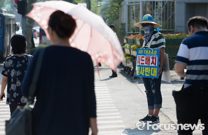 (서울=포커스뉴스) 사드 성주배치 철회 촉구 1인 시위가 이어지고 있는 8일 오전 서울 용산구 국방부 앞에 출근하는 시민들이 지나가고 있다.