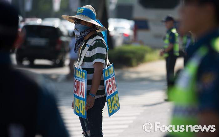 (서울=포커스뉴스) 8일 오전 서울 용산구 국방부 앞에서 사드배치철회 성주투쟁위원회 소속 성주군민이 사드 성주배치 철회를 촉구하는 피켓을 몸에 걸고 서 있다.