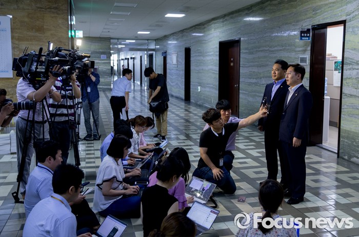 (서울=포커스뉴스) 8일 오전 서울 여의도 국회 의안과에서 박범계(오른쪽) 더불어민주당 의원과 이용주 국민의당 의원이 고위공직자비리수사처 설치 법안을 제출한 뒤 취재진 질문에 답하고 있다.