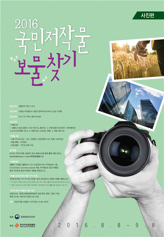 문체부 정책 담당자는 "사진저작물은 디지털 기기의 발달로 인해 누구나 쉽게 접근할 수 있으므로 폭넓은 참여가 예상된다"라며 "휴가기간에 찍은 멋진 여행 사진들이 개인 컴퓨터 속에서 사라지지 않도록 공유마당에서 유통시켜 주기 바란다"라고 밝혔다.2016 국민저작물보물찾기 포스터. <사진제공=문화체육관광부>