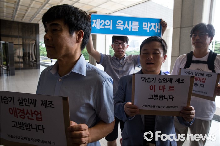 (서울=포커스뉴스) 8일 오전 서울 서초구 서울중앙지방검찰청 앞에서 가습기살균제참사전국네트워크 회원들이 SK케미칼, 애경산업, 이마트에 대한 수사를 촉구하며 3개사 전·현직 최고위 임원들에 대한 고발장을 제출하고 있다.