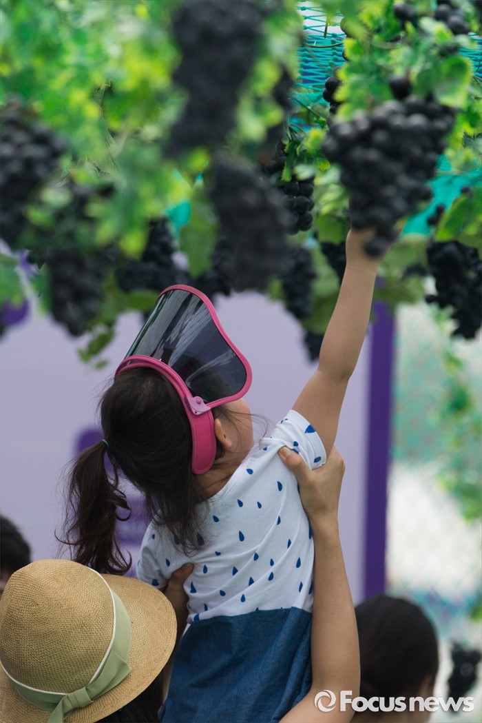 (서울=포커스뉴스) 8일 오전 서울 광화문광장에서 열린 '2016 포도데이' 행사에 참석한 한 어린아이가 엄마 도움을 받으며 포도를 따고 있다.