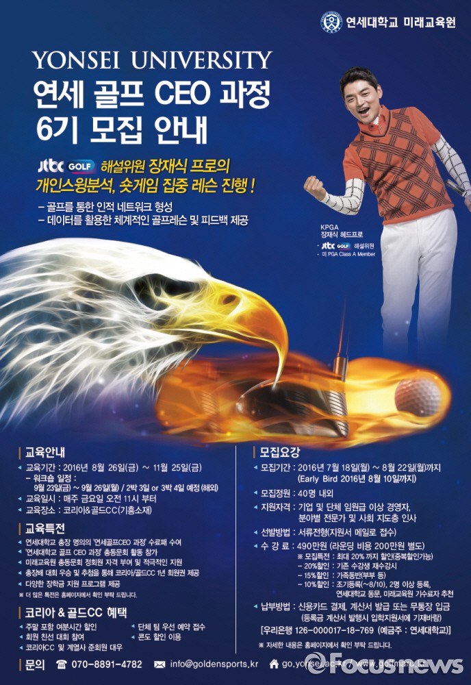 (서울=포커스뉴스) JB그룹은 연세대 미래교육원에서 교육하는 '연세 골프 CEO 과정 6기' 수강생을 오는 22일까지 모집한다고 8일 밝혔다.